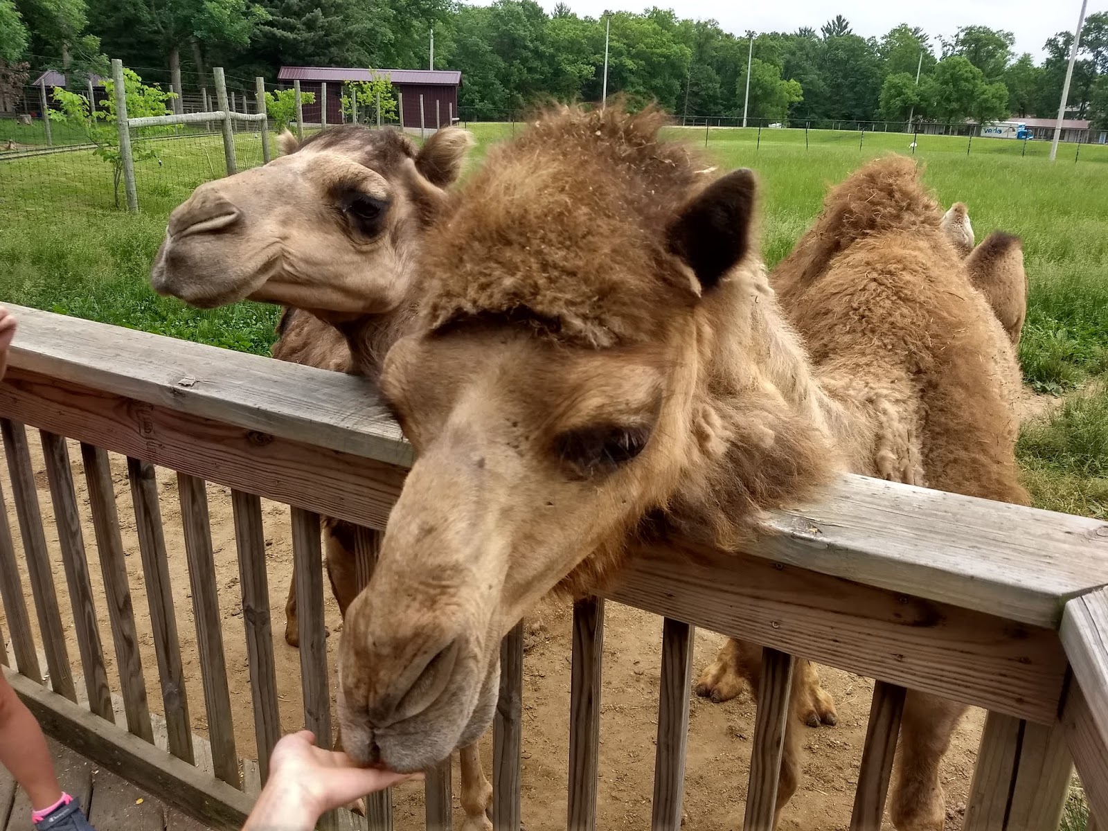 6.8.18 after super 8 breakfast we started our day with a trip to Timbivati wildlife park-tickets were included in our Kalihari stay. It was a lot of fun! There was a lion that wanted Rachel so bad! Over and over again it literally tried to get her by jumping up on the glass and clawing! Scary but really cool. It was so huge! Not crowded at all, pig races, petting and feeding giraffes, camels (including baby camels), feeding parkeets, petting turtles, snakes, skunks and seeing lots if active animals. All FREE with our stay! They charged for food to feed the animals but we found plenty on the ground to feed them for free 😁. We are lunch and headed to Great Wolf Lodge-our last resort. We checked in at about 1:30, headed to the water park and played, checked out our room (really big and nice including two queens, pull out bed, fireplace and balcony), Caden, Rachel and Mommy took naps while Dad, Parker and Spencer went back out to the water parks. Then we went to Denny's for dinner and came back to the resort for story time where they also got to meet the wolf mascot, got ice cream, watched the clock tower show which honestly was underwhelming, and did the dance party where they got shiny pom poms to dance with and keep. It was fun! Then off to bed.