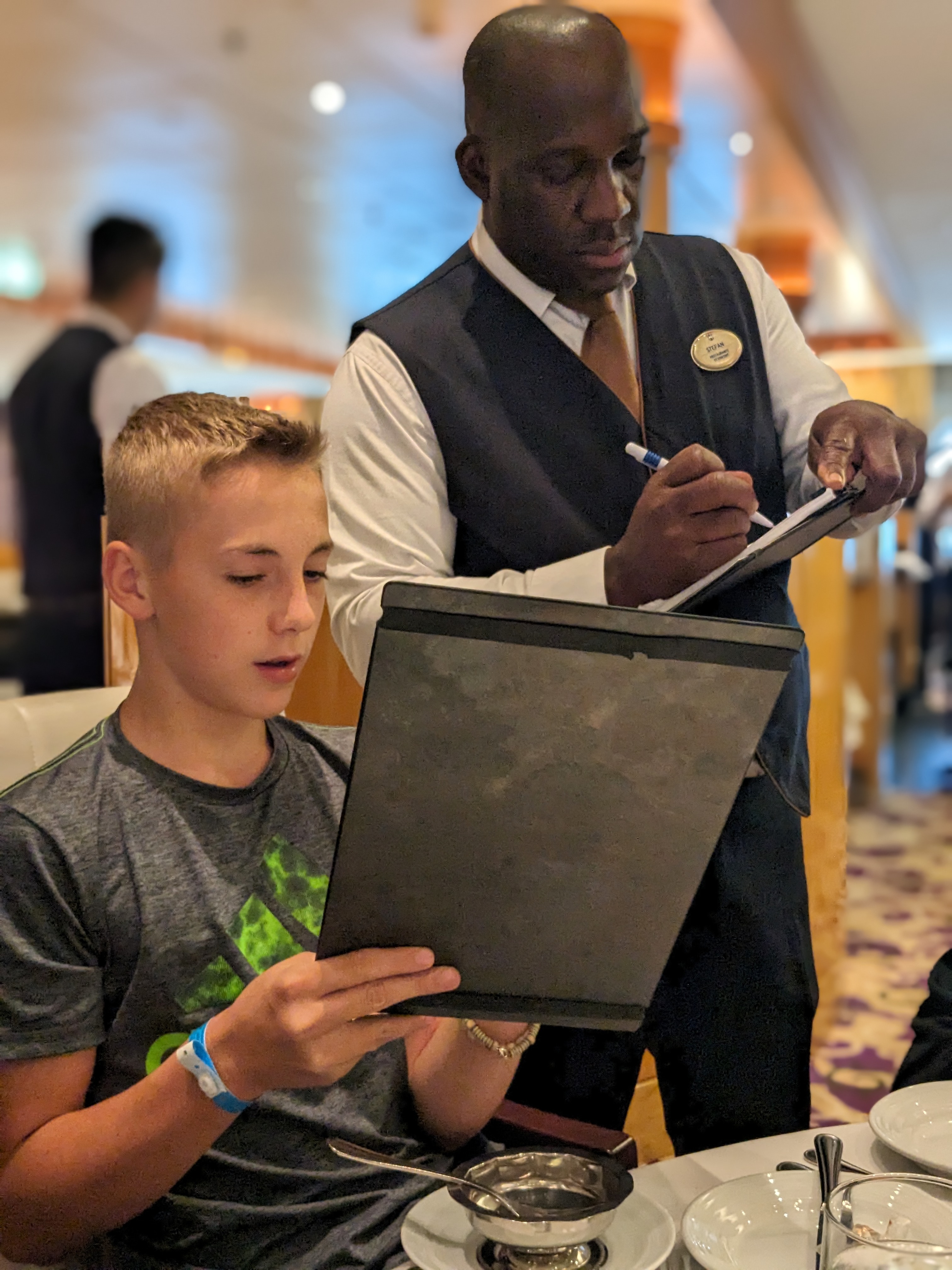 -Today was a sea day. It was quite rocky the first half of the day. We went with the kids to explore a bit, play pickleball, eat , eat some more, watch the water splash out of the pool from the rocking, etc. Then the kids went to kids club while Darrin and I went hot tubbing for a couple hours. We met some nice people we chatted with for a long time. Then we picked up the kids, got ready for formal night and went to dinner. We enjoyed our dinner, put the kids to bed and Darrin and I went to the comedy juggling show with the other adults. Parker stayed in Wes and Jenicas room while their kids slept while they went to the show.