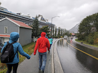-All the adults got off the ship in Juno where it was pouring rain. We had to walk 20 minutes in the rain to make it in time to our whale watching tour through Juno tours. They had shuttle busses to downtown but we weren't sure they were going the right place plus the line was really long for it so we just walked. Turns out it did go to the right place 😁.